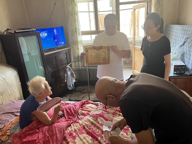 6月28日,安裝公司、物業(yè)公司聯(lián)合旱西關(guān)東社區(qū)工作人員組成慰問小組開展“慰問抗美援朝老兵遺孀 真情傳遞溫暖人心”慰問活動(dòng)。活動(dòng)中,慰問組一行前往抗美援朝老兵史黑則遺孀家中,詳細(xì)詢問了老人的生活和身體情況,叮囑老人要保重身體、安享晚年,并送去了牛奶、瓜果等慰問品。同時(shí),慰問組一行還看到了保存多年的獎(jiǎng)?wù)录白C書,大家紛紛表示要繼承革命先輩的光榮傳統(tǒng),汲取紅色力量,堅(jiān)定奮進(jìn)步伐,用實(shí)際行動(dòng)迎接黨的二十大勝利召開。