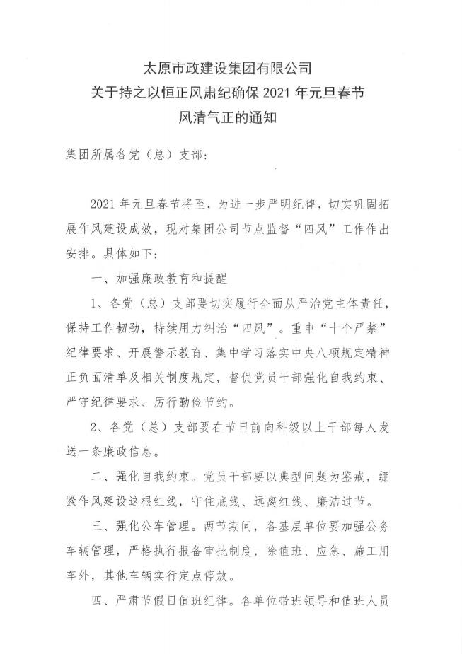 太原市政建設(shè)集團(tuán)有限公司關(guān)于持之以恒正風(fēng)肅紀(jì)確保2021年元旦春節(jié)風(fēng)清氣正的通知