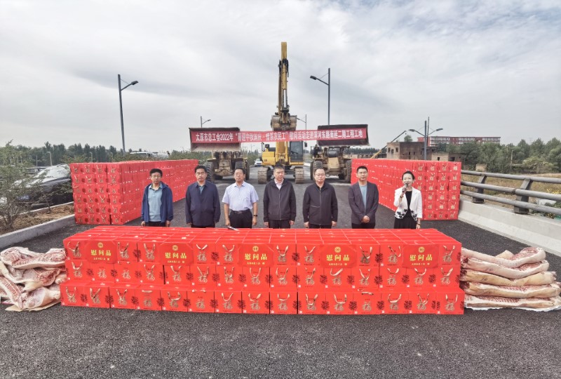 活動中,太原市總工會領導來到施工現(xiàn)場與一線施工人員進行親切交談,了解施工和生活情況,并為大家送來了月餅、豬肉等慰問品。