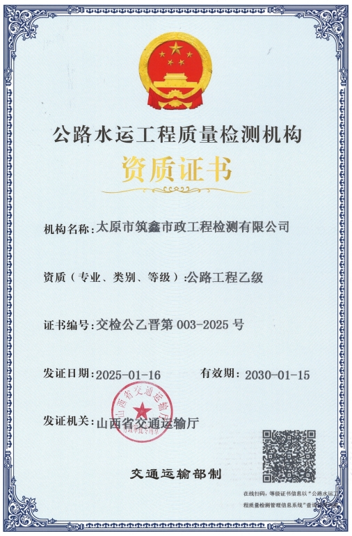 近日,筑鑫公司成功獲得公路水運工程質(zhì)量檢測機構(gòu)“公路工程乙級”資質(zhì)證書。此次資質(zhì)升級,不僅是對筑鑫公司在公路工程檢測領(lǐng)域?qū)I(yè)實力的有力證明,更是其實現(xiàn)跨領(lǐng)域發(fā)展的重要里程碑,意味著下一步能夠為公路工程建設(shè)提供更多維度、更具專業(yè)性與精準度的檢測服務(wù)。