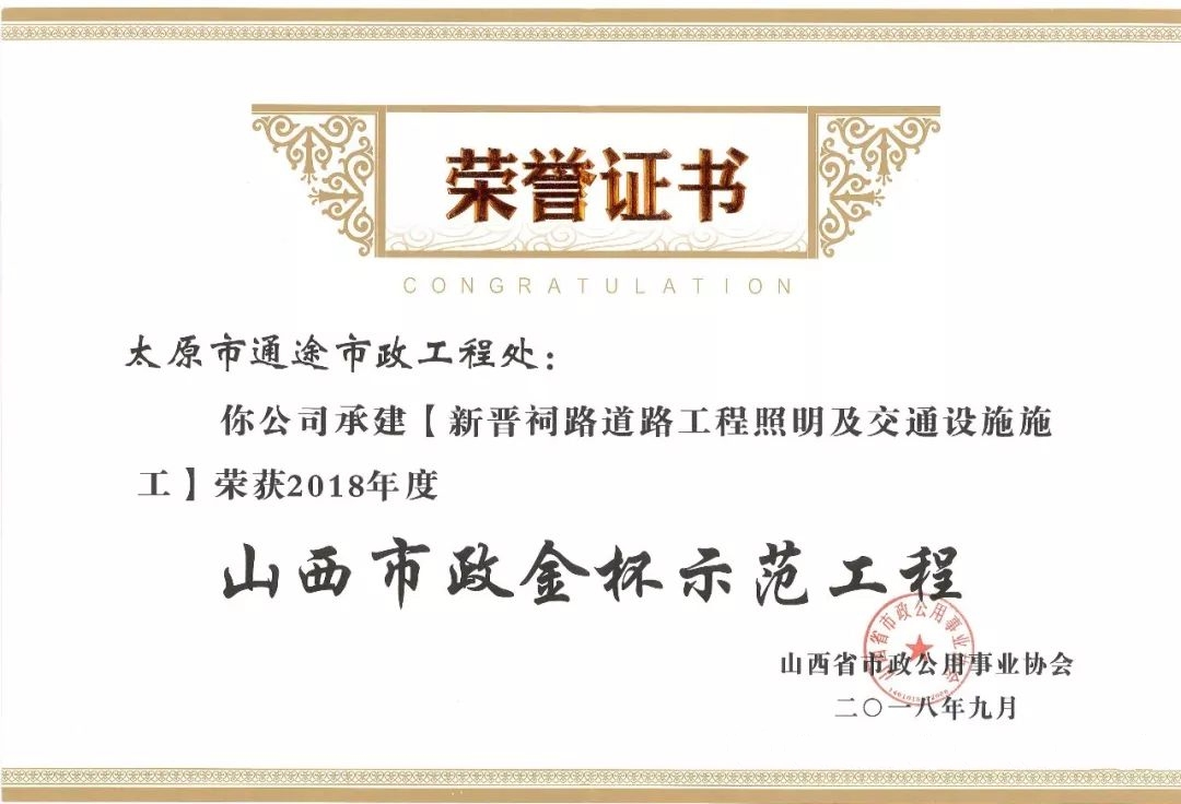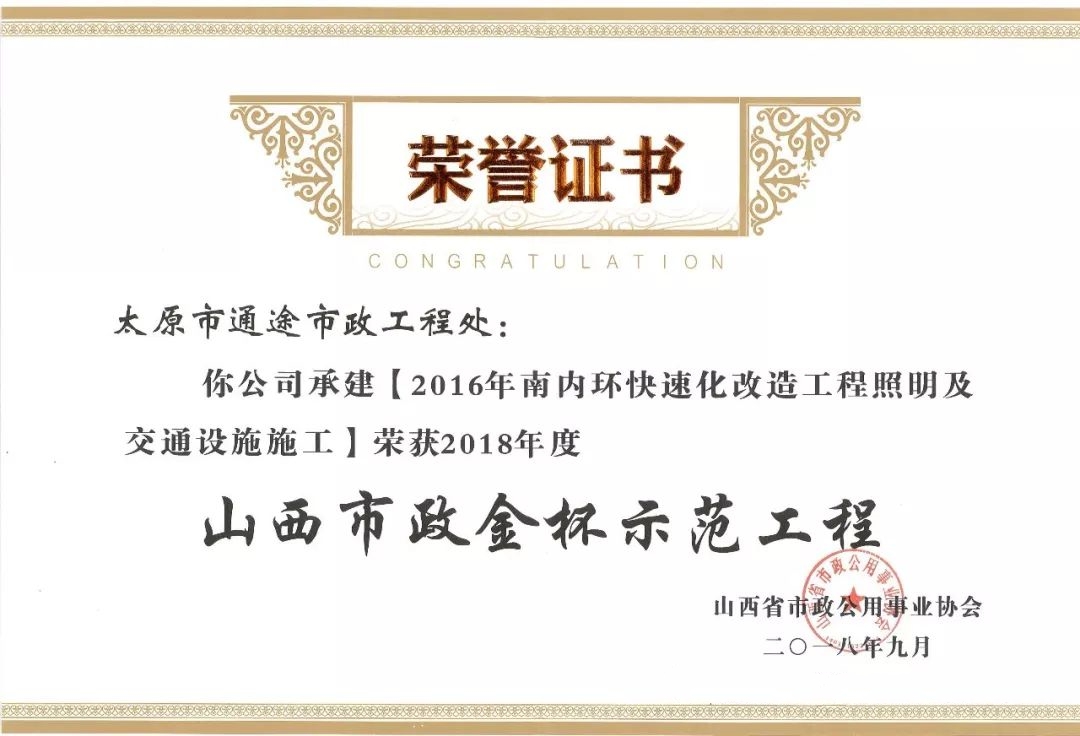 9月20日,通途市政工程處承建的南內(nèi)環(huán)快速化改造工程照明及交通設(shè)施施工、新晉祠路道路工程照明及交通設(shè)施施工榮獲山西省市政公用事業(yè)協(xié)會(huì)頒發(fā)的2018年度“山西市政金杯示范工程”榮譽(yù)稱號(hào)。