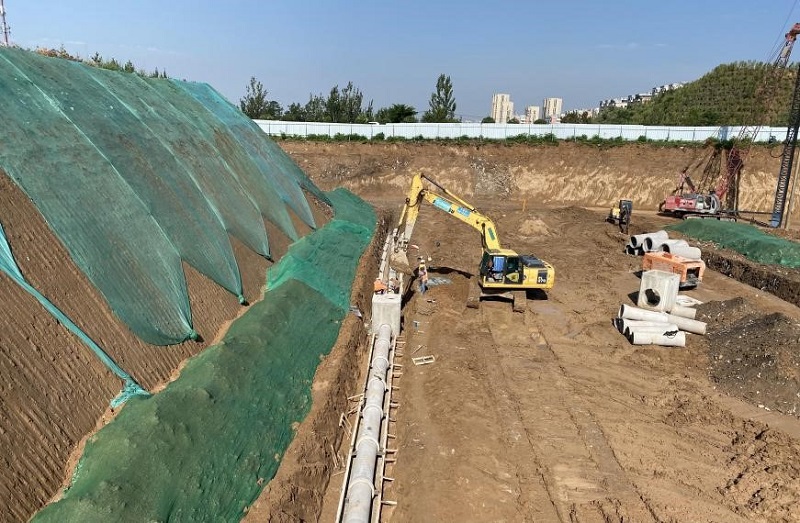 該工程雨污水管道、電力隧道的部分管線為深溝槽作業(yè),溝槽平均深度為4米,最深處達(dá)6米。同時(shí),該工程部分路段涉及挖方量大的情況,這些都增加了施工難度和危險(xiǎn)系數(shù)。項(xiàng)目部技術(shù)人員根據(jù)施工現(xiàn)場(chǎng)實(shí)際情況,共同研究應(yīng)對(duì)措施,制定了《深溝槽開挖專項(xiàng)方案》和《大挖方邊坡修整、支護(hù)方案》,采取了分級(jí)放坡開挖和邊支護(hù)邊開挖的方式,有效防止兩側(cè)土體的塌落;在挖方路塹施工時(shí),及時(shí)掛網(wǎng)噴漿,有效維護(hù)了邊坡穩(wěn)定;在開挖坡頂設(shè)置了截水溝,有效防止雨水的溝槽和邊坡的沖刷和浸泡,增加了施工的安全系數(shù),切實(shí)保證了在溝槽和路塹開挖段內(nèi)作業(yè)機(jī)械和人員的安全。
