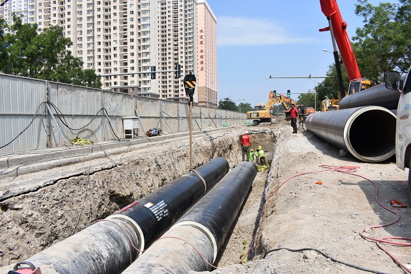 改造期間,項目部施工技術(shù)人員根據(jù)道路兩側(cè)預期規(guī)劃,提前制定了擴改方案,使用設計管徑為DN1000的供熱管道,為轄區(qū)內(nèi)的小區(qū)預留出供熱余量。由于該工程位于老城區(qū),地下管線尤為復雜,加之前期現(xiàn)狀管線資料不全,施工開始前,太原城市建設有限公司第五項目部的技術(shù)人員就提前做好溝槽的定位工作,采取整體放線、統(tǒng)一開挖的辦法,通過計算,提前讓熱力管道逐漸改變坡度,有效避開污水管道、燃氣管道等障礙物。同時,由于管道沿線區(qū)域地下水位高,施工人員根據(jù)現(xiàn)場實際情況,安裝了15個100毫米口徑的電動多級離心泵進行明排水施工,保證了施工進度。