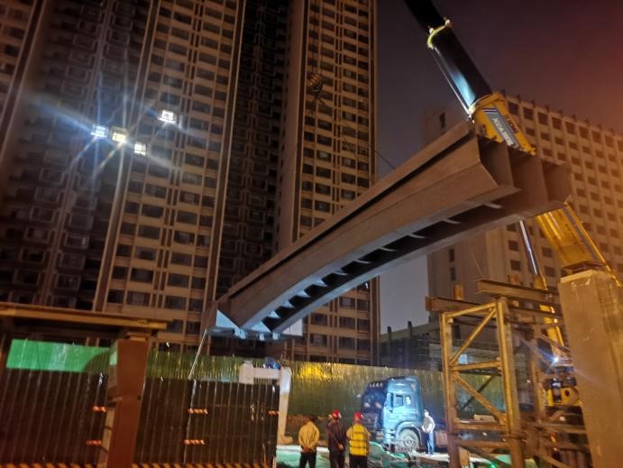 十項(xiàng)目部承建了北中環(huán)森林公園南門、濱河西路市圖書館北側(cè)、濱河西路三給街口共3座人行天橋。在北中環(huán)森林公園南門人行天橋的施工中,項(xiàng)目部結(jié)合橋梁跨度過大,北中環(huán)街車流量大等實(shí)際,組織全體參建人員加班加點(diǎn),24小時(shí)不停作業(yè),并合理安排夜間施工段進(jìn)行鋼箱梁吊裝工作。吊裝過程中,施工人員緊盯現(xiàn)場,嚴(yán)格控制主橋軸線位置漂移量及臨時(shí)支架的搭設(shè)高度,保證每段鋼箱梁焊縫按規(guī)范要求進(jìn)行。同時(shí),在封路期間項(xiàng)目部提前與周邊小區(qū)物業(yè)進(jìn)行溝通,并安排專人在現(xiàn)場進(jìn)行疏導(dǎo),保證施工安全順利實(shí)施,用時(shí)3個(gè)晚上完成鋼箱梁吊裝工作,盡量減小對周邊居民的出行影響。截至目前,北中環(huán)森林公園南門人行天橋、濱河西路市圖書館北側(cè)人行天橋、濱河西路三給街口人行天橋主橋鋼箱梁已全部吊裝完成。三座天橋正在進(jìn)行主橋鋼箱梁焊接及梯坡道吊裝、護(hù)欄安裝、橋面鋪裝,恢復(fù)非機(jī)動車道路面及人行道結(jié)構(gòu)等工作。