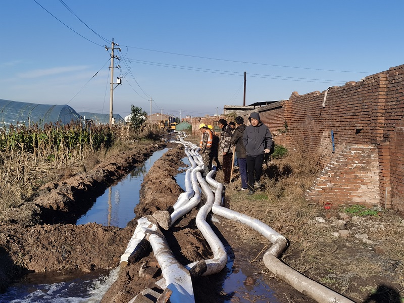 由于該村緊鄰象峪河,因河道水位持續(xù)高漲,村內(nèi)積水無法自然排出,導(dǎo)致近98萬平方米耕地被淹,總積水量約為60萬立方米。搶險(xiǎn)突擊隊(duì)以里旺村小區(qū)西側(cè)耕地最低點(diǎn)為起點(diǎn),呈樹枝狀布置水泵,以村莊東處的象峪河為排水末端,通過最低點(diǎn)水泵提升、中端水泵轉(zhuǎn)輸、末端水泵強(qiáng)排的三級(jí)聯(lián)排,并利用地形高差、開溝槽下管引流等方式降低耕地整體水位。經(jīng)過六天的晝夜奮戰(zhàn),截止10月18日晚,抽排積水約17萬立方米,積水面消退約15萬平方米,疏導(dǎo)退水渠約1400米。