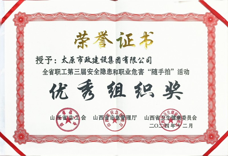 太原市政集團(tuán)被山西省總工會、山西省應(yīng)急廳、山西省衛(wèi)生健康委員會授予全省職工第三屆安全隱患和職業(yè)危害“隨手拍”活動優(yōu)秀組織獎,其中三名職工的“隨手拍”作品獲得優(yōu)秀獎。