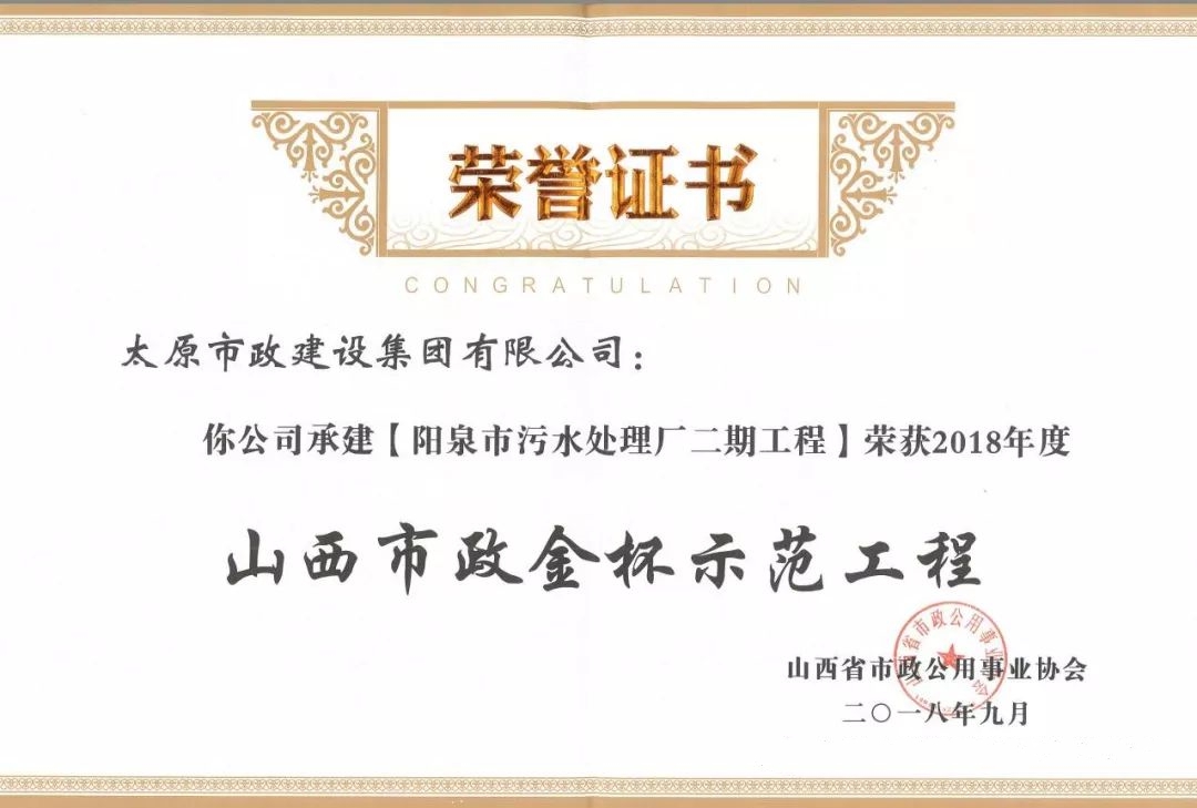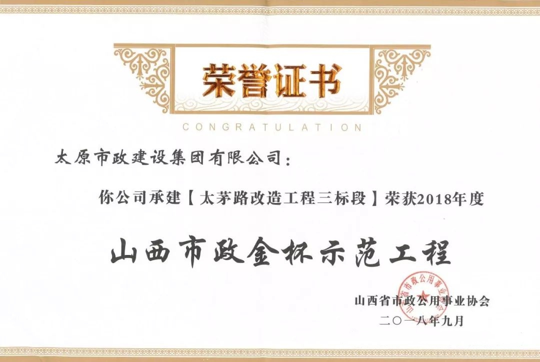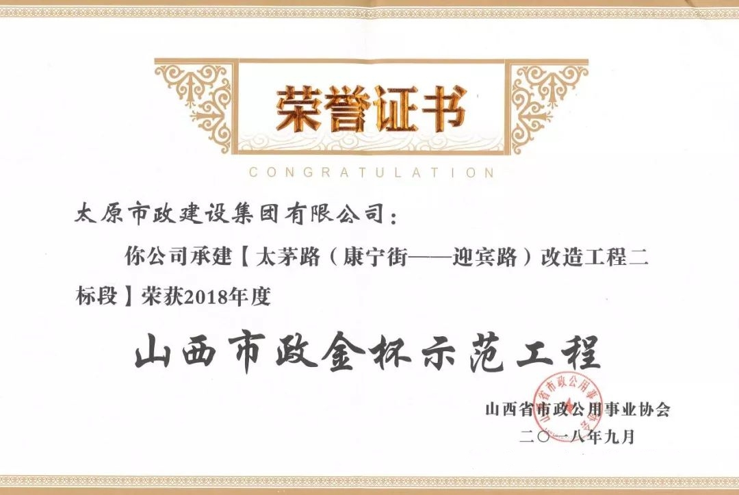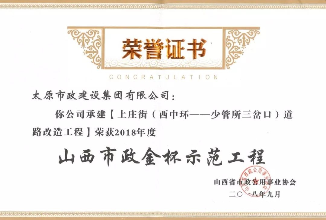 9月20日,太原市政建設(shè)集團有限公司承建的太茅路改造工程三標段、陽泉市污水處理廠二期工程、上莊街(西中環(huán)——少管所三岔口)道路改造工程、太茅路(康寧街——迎賓路)改造工程二標段榮獲山西省市政公用事業(yè)協(xié)會頒發(fā)的2018年度“山西市政金杯示范工程”榮譽稱號。