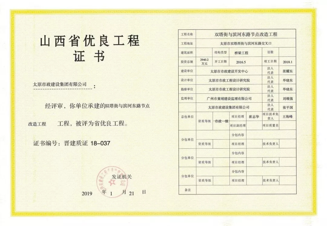 太原市政建設(shè)集團(tuán)有限公司雙塔街與濱河?xùn)|路節(jié)點(diǎn)改造工程榮獲“山西省優(yōu)良工程”榮譽(yù)稱號