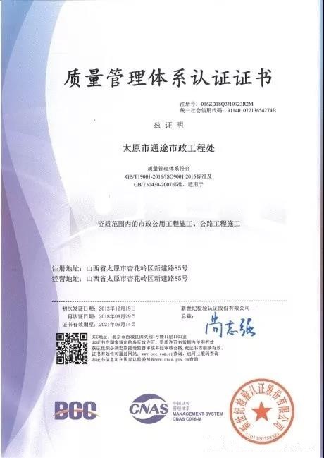 本次認(rèn)證審核工作得到了審核組的充分肯定,進(jìn)一步促進(jìn)了通途市政工程處生產(chǎn)經(jīng)營(yíng)管理的規(guī)范化、科學(xué)化。