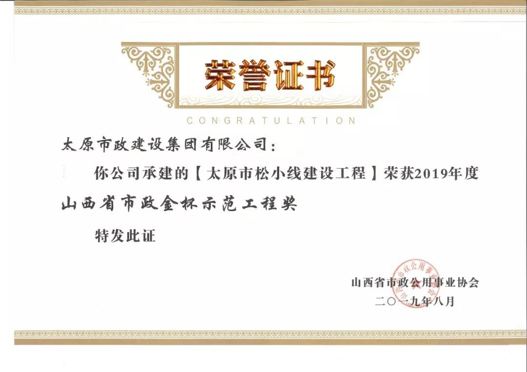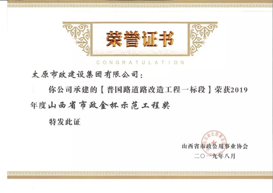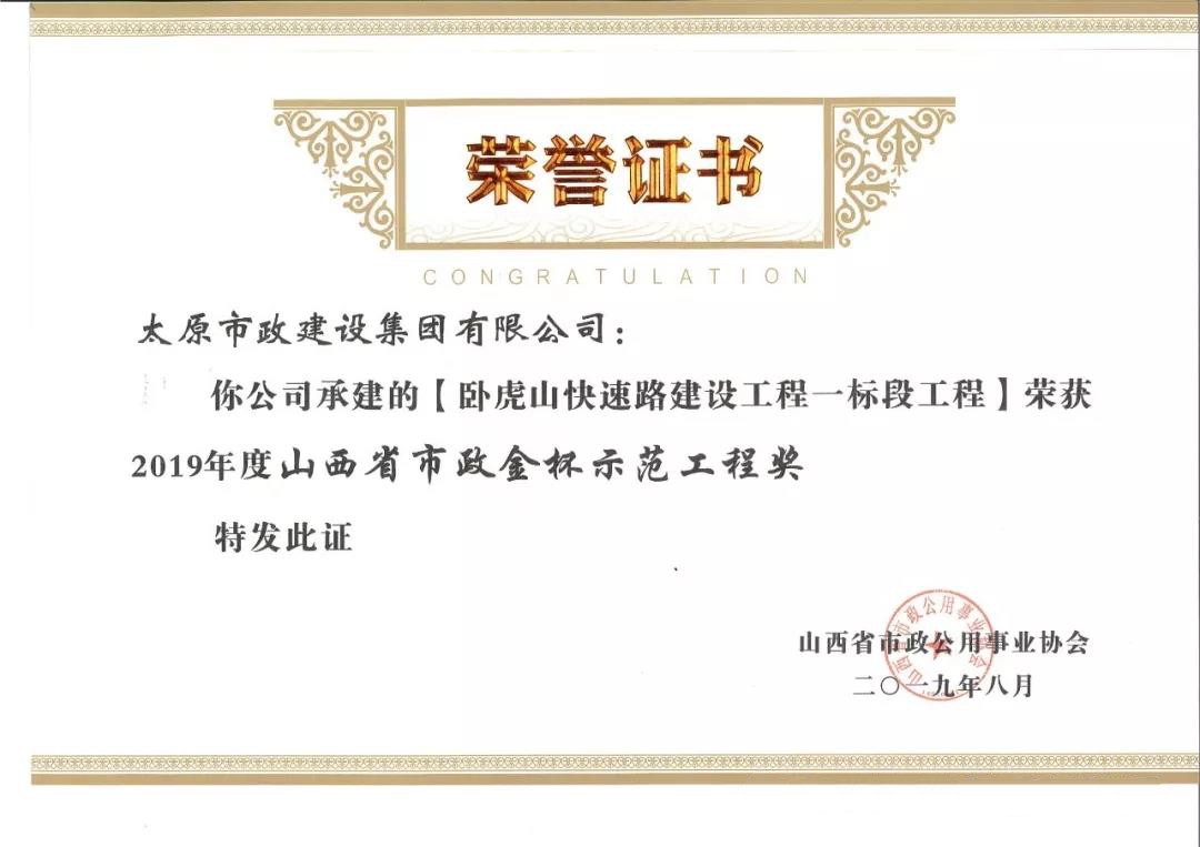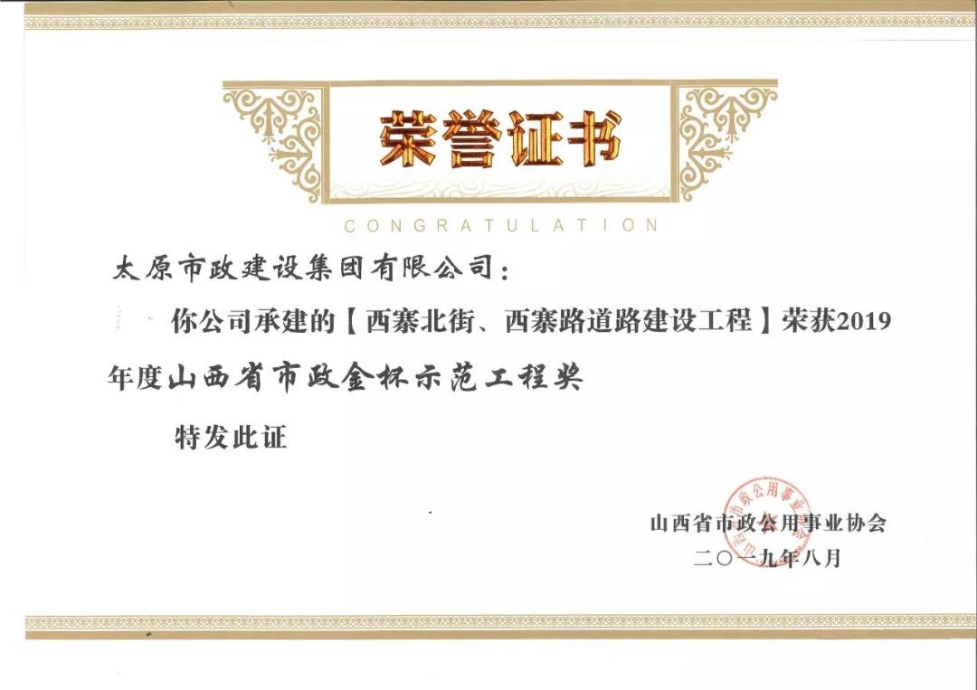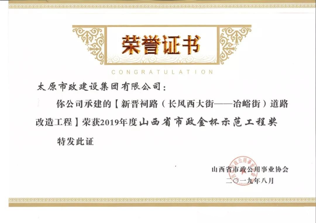 近日,太原市政建設(shè)集團有限公司承建的太原市松小線建設(shè)工程,新晉祠路(長風西大街-冶峪街)道路改造工程,臥虎山快速路建設(shè)工程一標段工程,普國路道路改造工程一標段,西寨北街、西寨路道路建設(shè)工程榮獲山西省市政公用事業(yè)協(xié)會頒發(fā)的2019年度“山西省市政金杯示范工程”榮譽稱號。集團公司王愛蓮、劉桂英、李瑞金、閆玲、王根和榮獲2019年度“山西市政工程優(yōu)秀項目經(jīng)理”榮譽稱號。