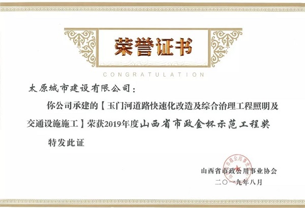 近日,太原城建公司玉門河道路快速化改造及綜合治理工程照明及交通設(shè)施工程榮獲山西省市政公用事業(yè)協(xié)會頒發(fā)的2019年度“山西省市政金杯示范工程獎”。太原城建公司靳耕榮獲2019年度“山西市政工程優(yōu)秀項目經(jīng)理”榮譽稱號。