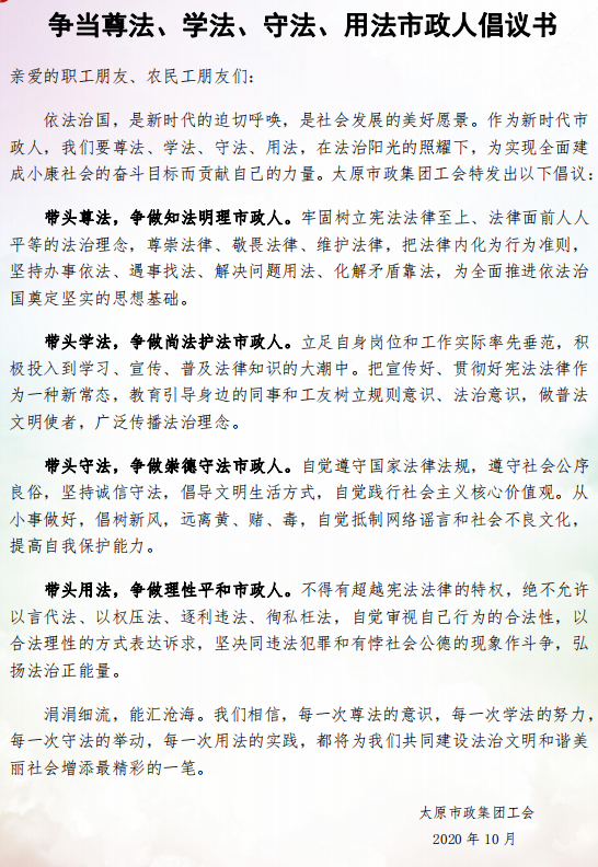 活動中,律師事務(wù)所的5名律師現(xiàn)場為職工、農(nóng)民工進(jìn)行了法律宣傳和咨詢。集團(tuán)公司工會工作人員為大家發(fā)放了《爭當(dāng)尊法、學(xué)法、守法、用法市政人倡議書》、法律宣傳資料以及活動紀(jì)念品。同時(shí),參加活動的職工和農(nóng)民工在2020年“尊法守法 攜手筑夢”服務(wù)農(nóng)民工法制宣傳行動條幅上簽名。