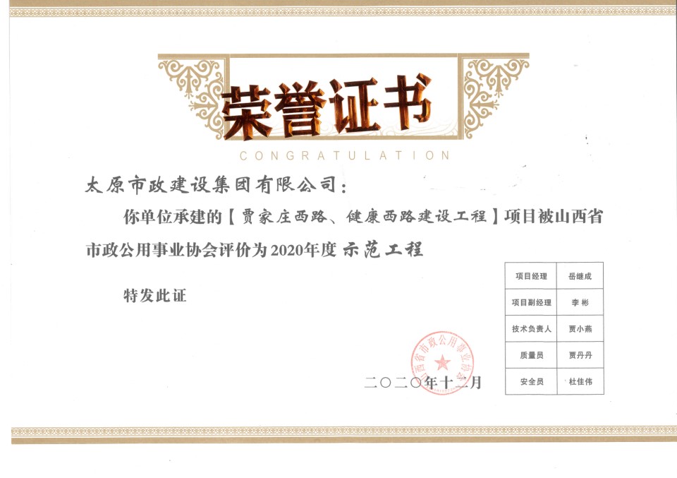 近日,集團公司承建的塢城北街、軍民路改造工程被山西省市政公用事業(yè)協(xié)會評為“2020年度精品示范工程”,東峰路北延(凱旋街—澗河搶險路)建設工程,賈家莊西路、健康西路建設工程被山西省市政公用事業(yè)協(xié)會評為“2020年度示范工程”。同時,高鴻、孔尹霞在2020年度山西省市政公用事業(yè)協(xié)會市政工程項目經理評價活動中被評為“優(yōu)秀項目經理”。