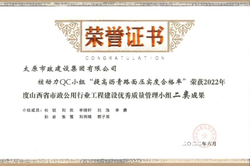 2022年度全國市政工程建設(shè)優(yōu)秀質(zhì)量管理小組三等獎_''核動力QC小組”提高瀝青路面壓實(shí)度合格率”