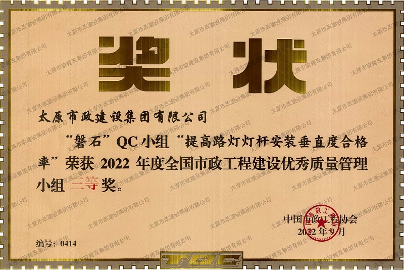 2022年度全國市政工程建設(shè)優(yōu)秀質(zhì)量管理小組三等獎_”磐石“QC 小組“提高路燈燈桿安裝垂直度合格率”
